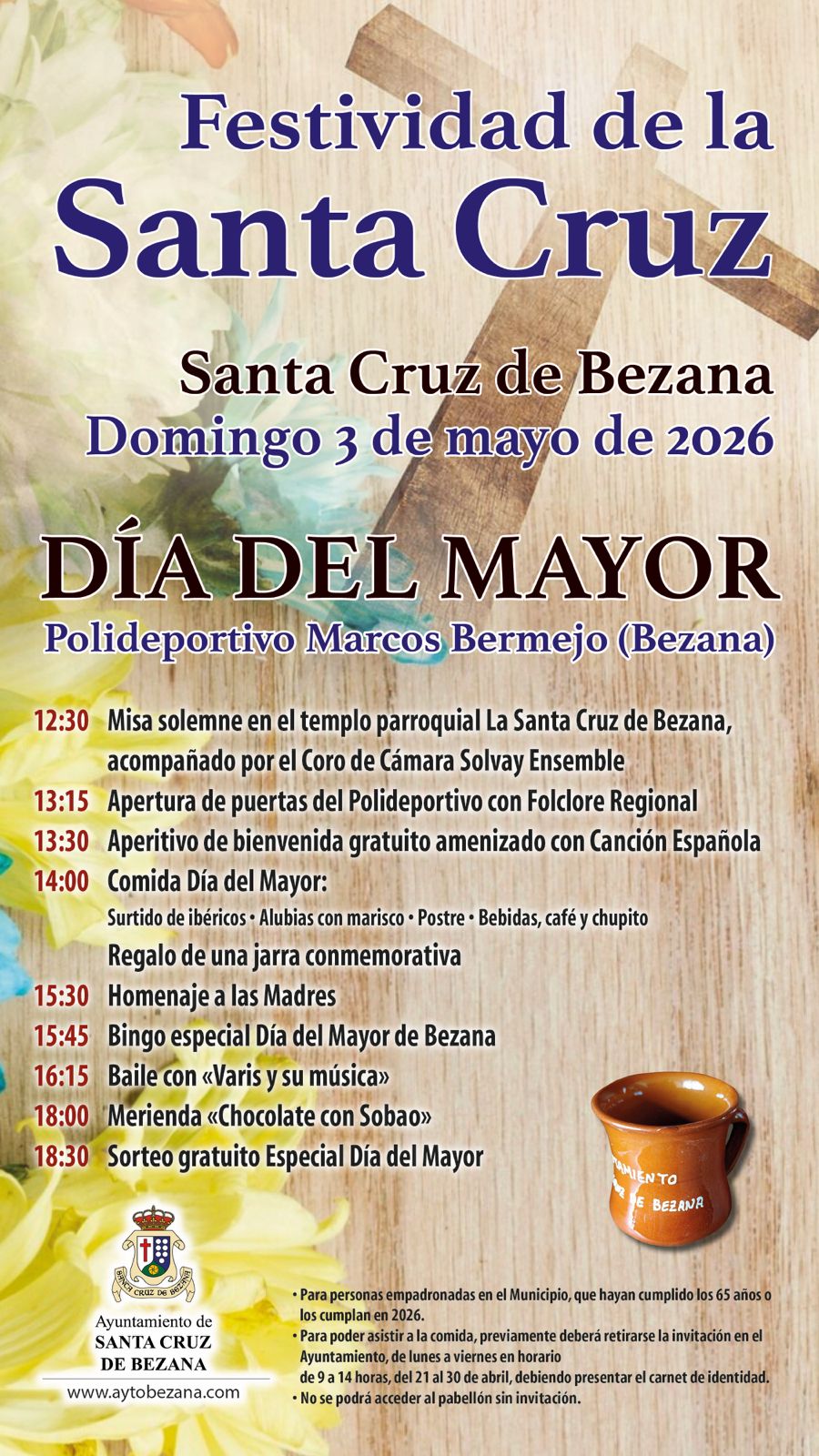 Coincidiendo con la festividad de la Santa Cruz tendrán lugar una jornada de especial que, tras la celebración de la misa solemne en la iglesia parroquial de Santa Cruz de Bezana (12:30), continuará en el Pabellón Polideportivo Marcos Bermejo donde, a partir de las 13:15 horas, se servirá un aperitivo que irá seguido de la tradicional comida de hermandad. A su término, el acto de homenaje de esta edición tendrá a las madres como protagonistas, y una vez realizado el reconocimiento habrá diversas actividades para amenizar la tarde a los asistentes.