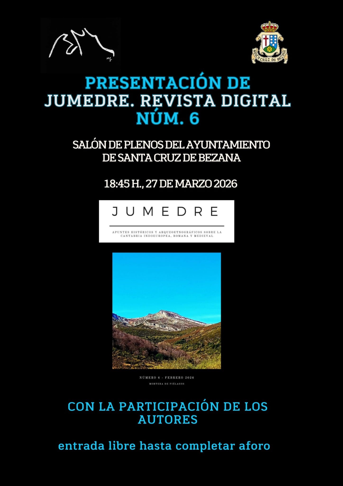 2026-03-27 18:45 Salón de Plenos del Ayuntamiento Presentación Jumedre Apuntes históricos y arqueoetnográficos sobre la Cantabria indoeuropea, romana y medieval en un nuevo número de la Revista Digital Jumedre, que será presentado con la participación de los autores.