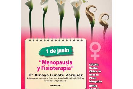 1June Charla: Menopausia y Fisioterapia 11.30 horas - Centro Cívico de Santa Cruz de Bezana (Plaza Margarita) La fisioterapeuta y osteópata Amaya Lunate Vázquez impartirá el próximo día 1